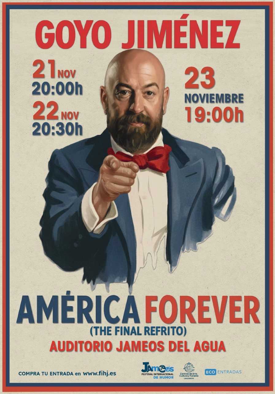 El Festival Internacional de Humor de Jameos del Agua dará la bienvenida los próximos 21, 22 y 23 de noviembre al reconocido humorista Goyo Jiménez, que presentará en el Auditorio Jameos del Agua su nuevo espectáculo “ América Forever”, un show que le devuelve a sus orígenes como “prescriptor” de la cultura estadounidense más iconográfica adaptada a las costumbres más españolas. Un espectáculo desternillante, y aclamado por la crítica.