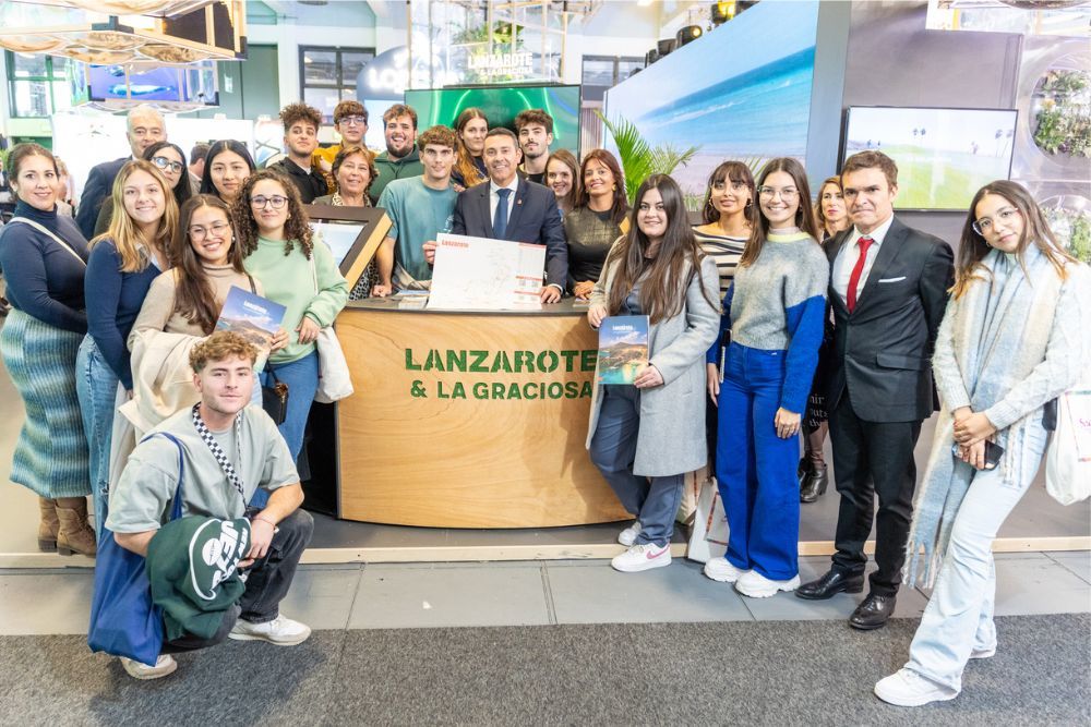 Un total de dieciocho alumnos y alumnas y dos profesoras de la Escuela de Turismo de Lanzarote visitaron, este martes, el stand de Lanzarote y La Graciosa en la inauguración de la ITB de Berlín. El presidente del Cabildo, Oswaldo Betancort, junto al consejero delegado de la Sociedad de Promoción Exterior de Lanzarote, Héctor Fernández, recibieron a la juventud lanzaroteña y pudieron conocer de primera mano su experiencia en este grado impartido en Lanzarote.