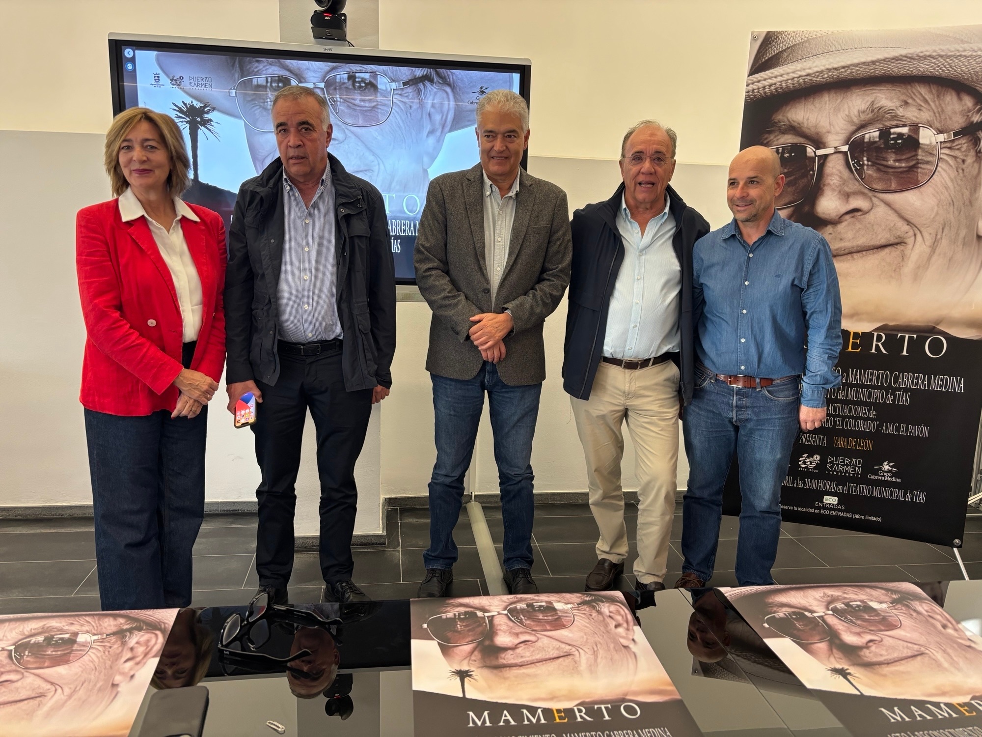El alcalde de Tías, José Juan Cruz, acompañado de la concejala de Cultura, Pepa González, y de dos de los hijos del homenajeado, Mamerto y Pedro Cabrera Cabrera, presentó hoy el evento y destacó la calidad humana de Mamerto Cabrera Medina, así como “el compromiso con su tierra y su capacidad para generar oportunidades para muchas familias”.