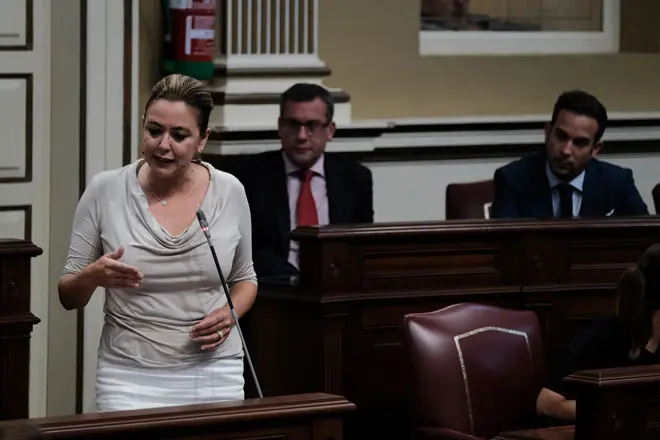La presidenta del Cabildo y diputada del Grupo Parlamentario Socialista por Lanzarote, María Dolores Corujo, pregunta al Gobierno por el procedimiento de adjudicación y obtiene el compromiso del gobierno.