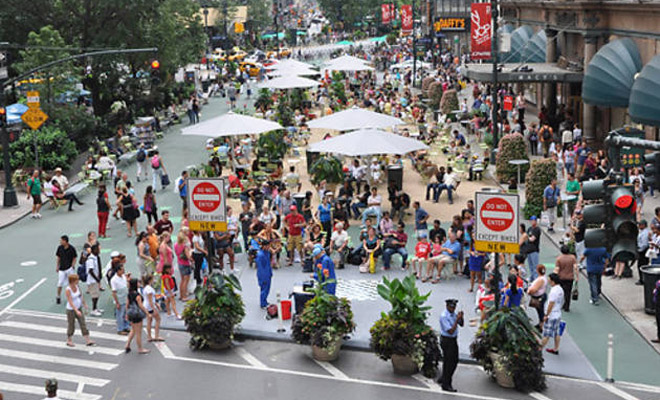 “Esto es lo que pasa cuando un día cualquiera cierras una calle al paso de los vehículos motorizados: que es tomada y ocupada por las personas. La foto es de Herald Square en Nueva York que saqué de Internet, pero ayer mismo en la ciudad de La Laguna hicieron lo mismo y se petó de gente con una experiencia piloto que quiere conectar peatonalmente la plaza del Cristo con la parada del Tranvía y la Universidad vieja”.
