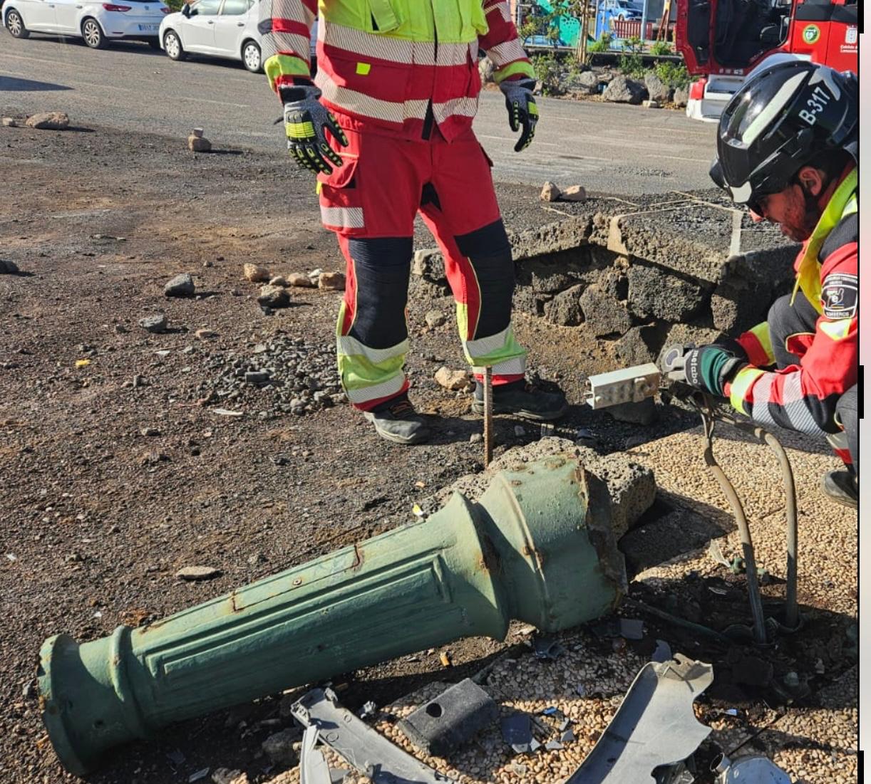 Los efectivos de seguridad y emergencias, alertados por la Policía Local de Arrecife, se dirigen a la avenida Olof Palme tras el impacto de un vehículo contra una farola de alumbrado público, que quedó caída en el suelo.