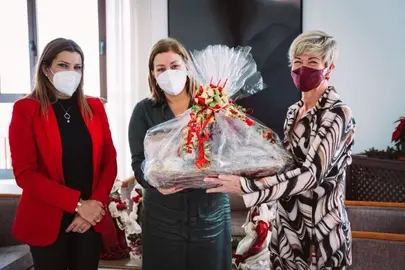 La alcaldesa de Arrecife, Astrid Pérez, y la edil de Servicios Sociales, María Jesús Tovar, felicitan a la ganadora del certamen, dirigido a los mayores de 60 años del municipio, y le hicieron…